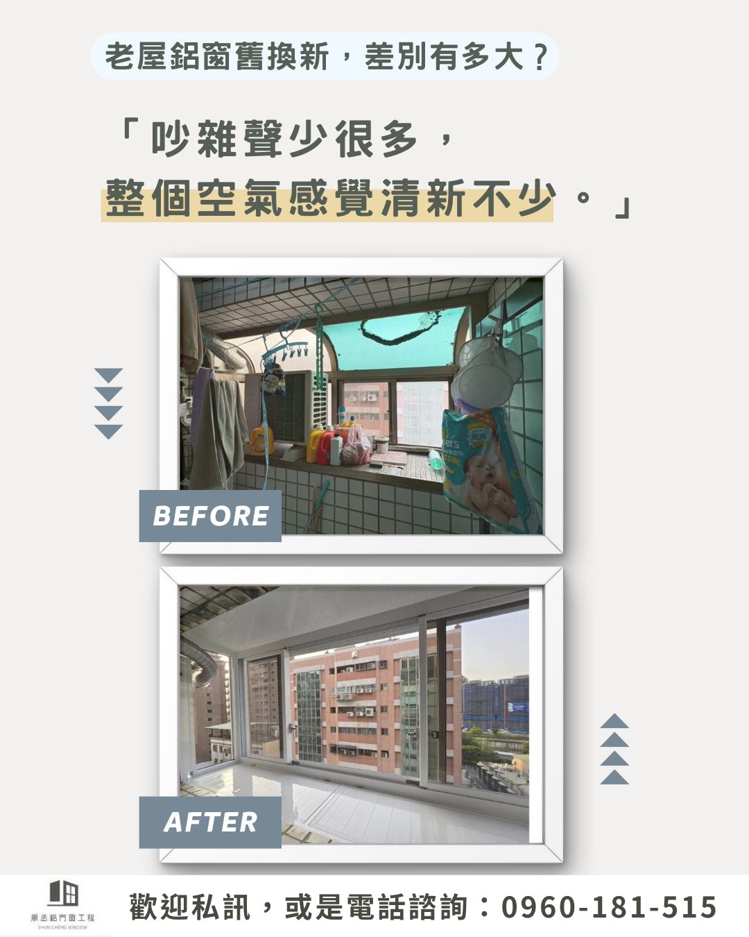 這場幫屋主更換了使用多年的老鋁窗,原本玻璃破損、隔音差、外觀也早已斑駁,屋主說,每次打掃心情都不太好,總覺得窗戶讓整個空間的氣氛變「卡卡的」,換上新鋁窗後,第一句話是:「吵雜聲少很多,整個空氣感覺清新不少。」
